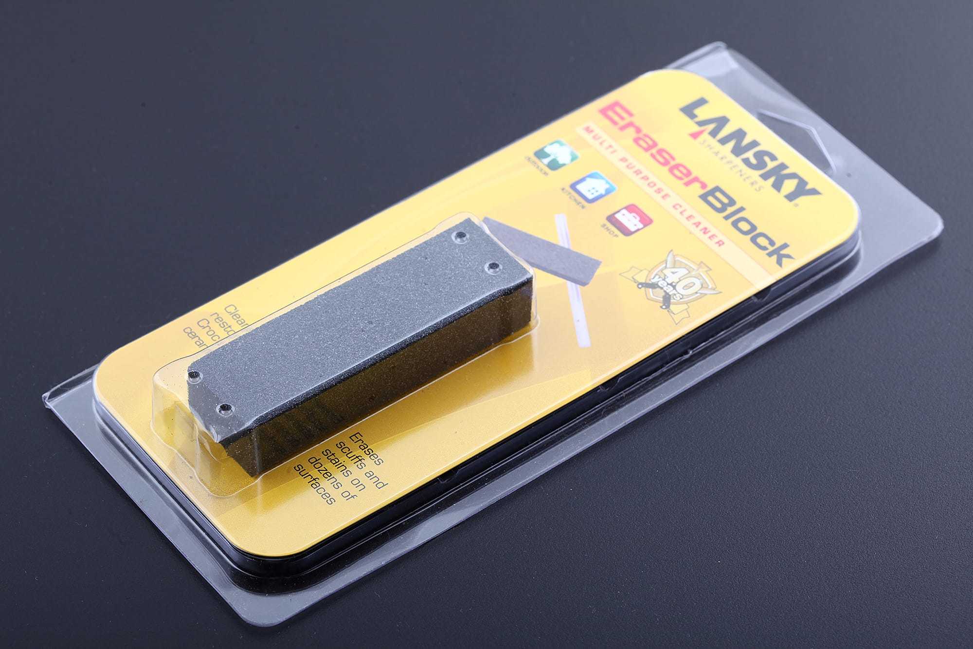 Ластик предназначен для чистки, восстановления керамических и алюмокерамических точильных брусков. Ластик возможно применять для очистки металлов от налета и помутнения покрытия и финишной доводки режущей кромки (снятия заусениц). Материал ластика полимерная резина с присадкой абразивных материалов. Благодаря малому весу и размеру ластик можно всегда носить на охоте, рыбалке или в турпоходе.